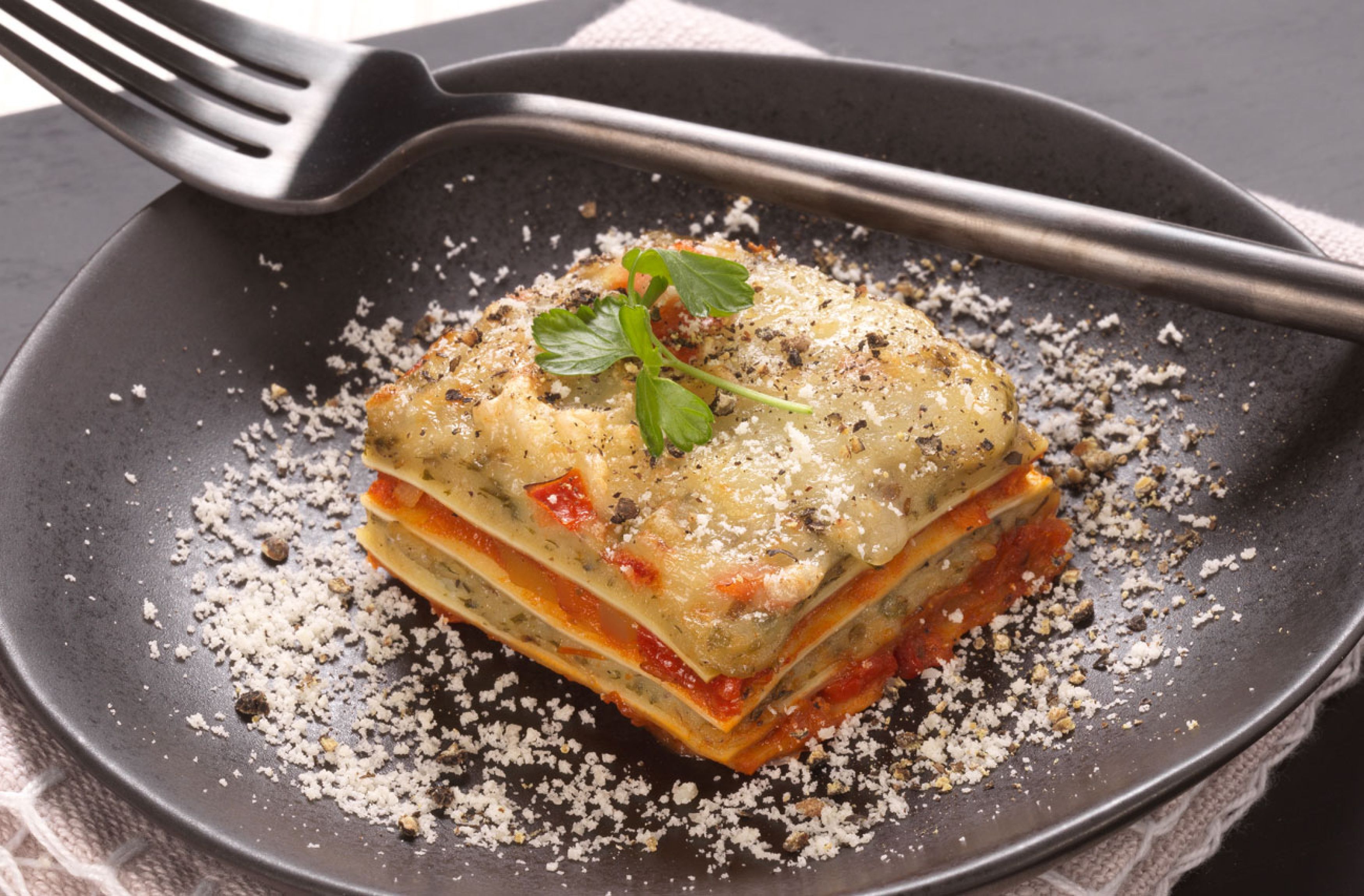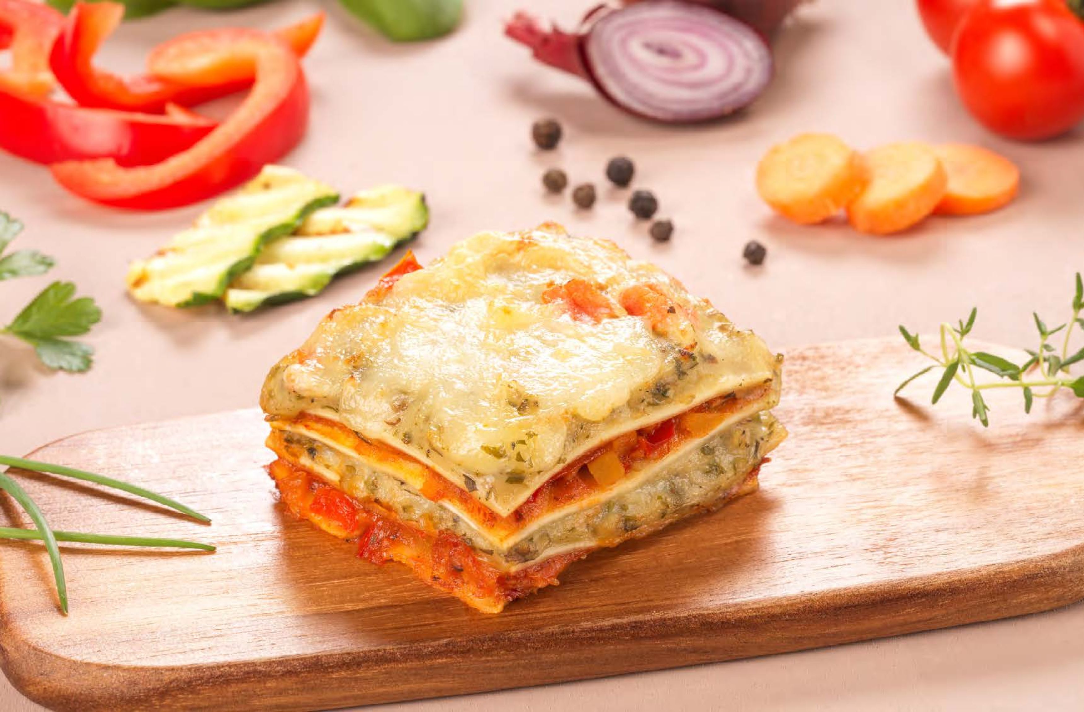 Mit einer herzhaften Grillgemüsefüllung aus Zucchini, Paprika, Karotten, Zwiebeln & Tomaten in Kräuter- Béchamèl & Käse-Topping