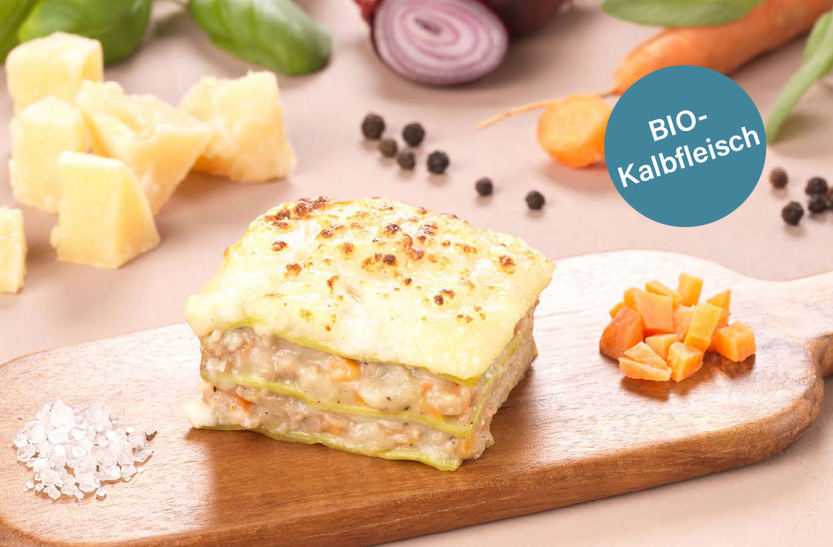 Mit weißer BIO-Kalbfleisch- Bolognese-Füllung und Béchamèl-Käse-Topping