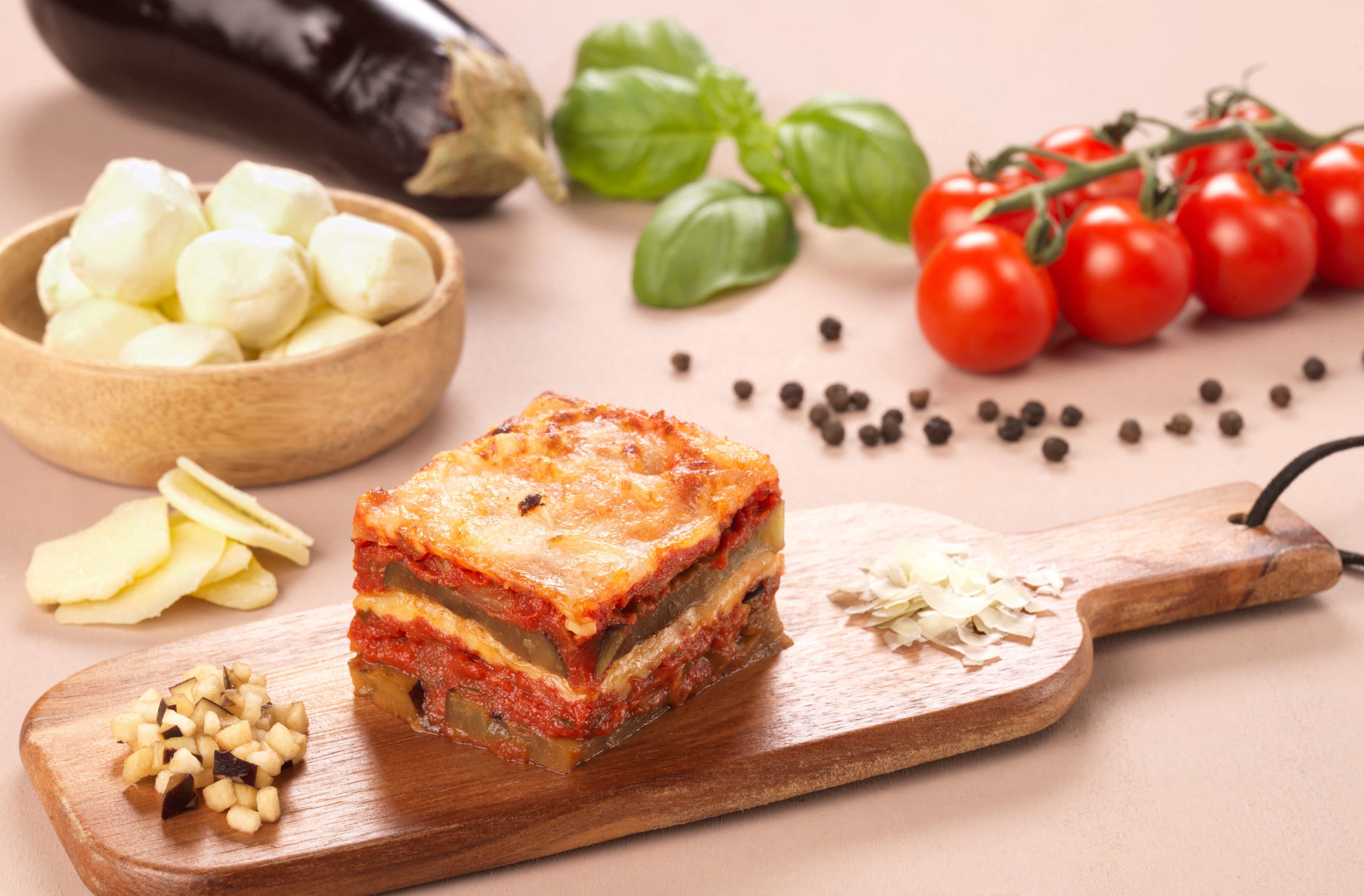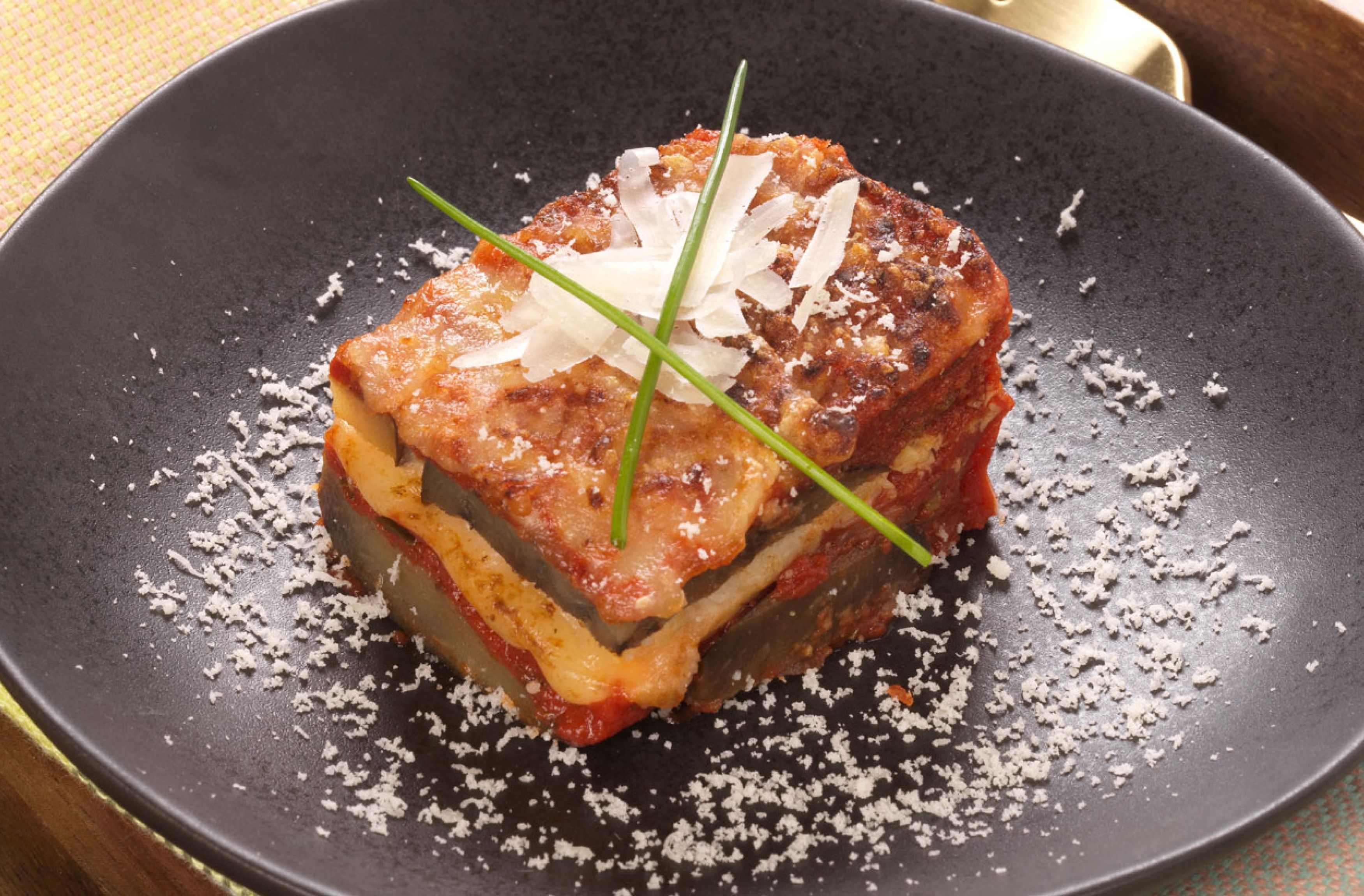 Geschichtet mit herzhaften Auberginen, Tomaten, Mozzarella und würzigem Hartkäse