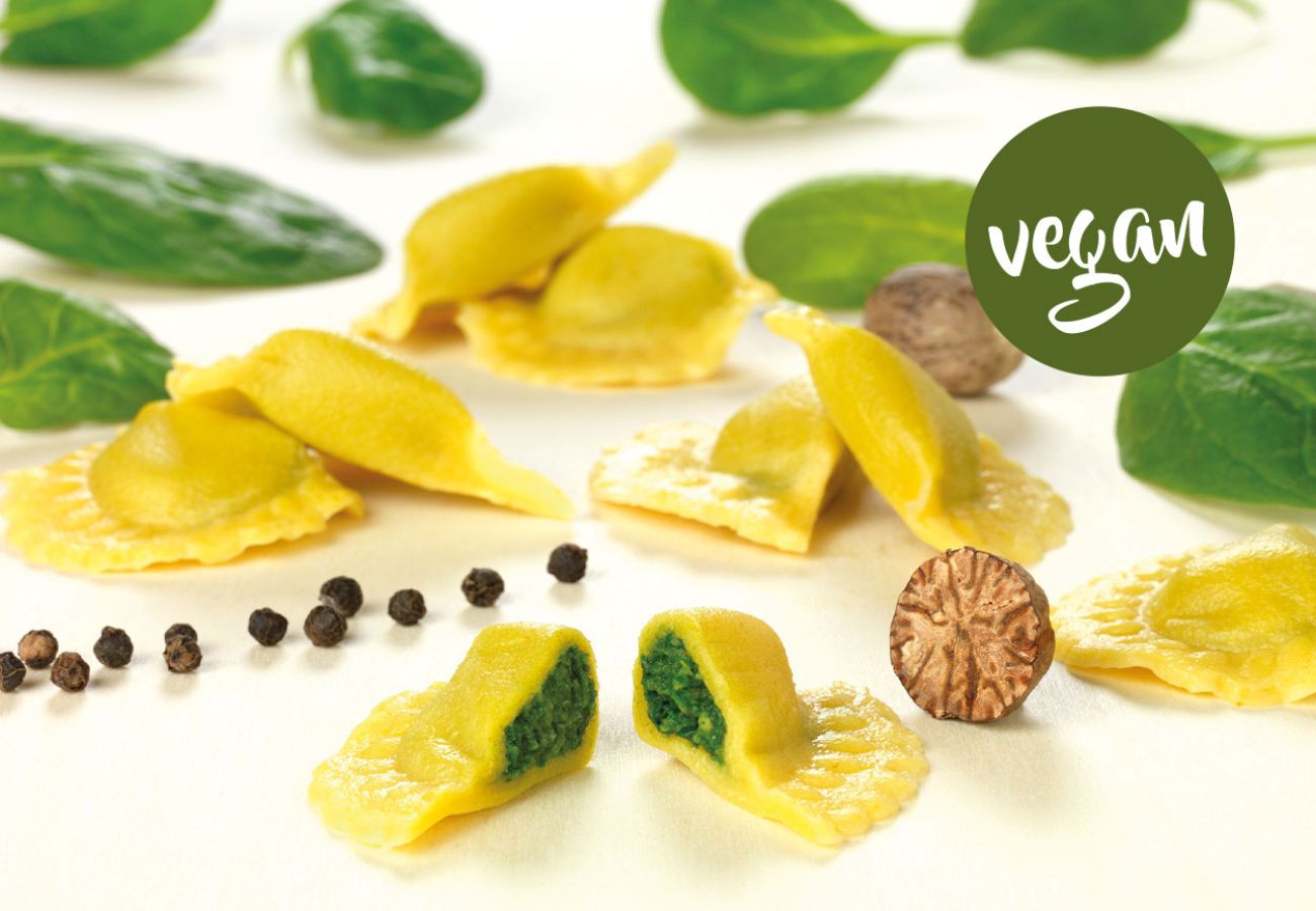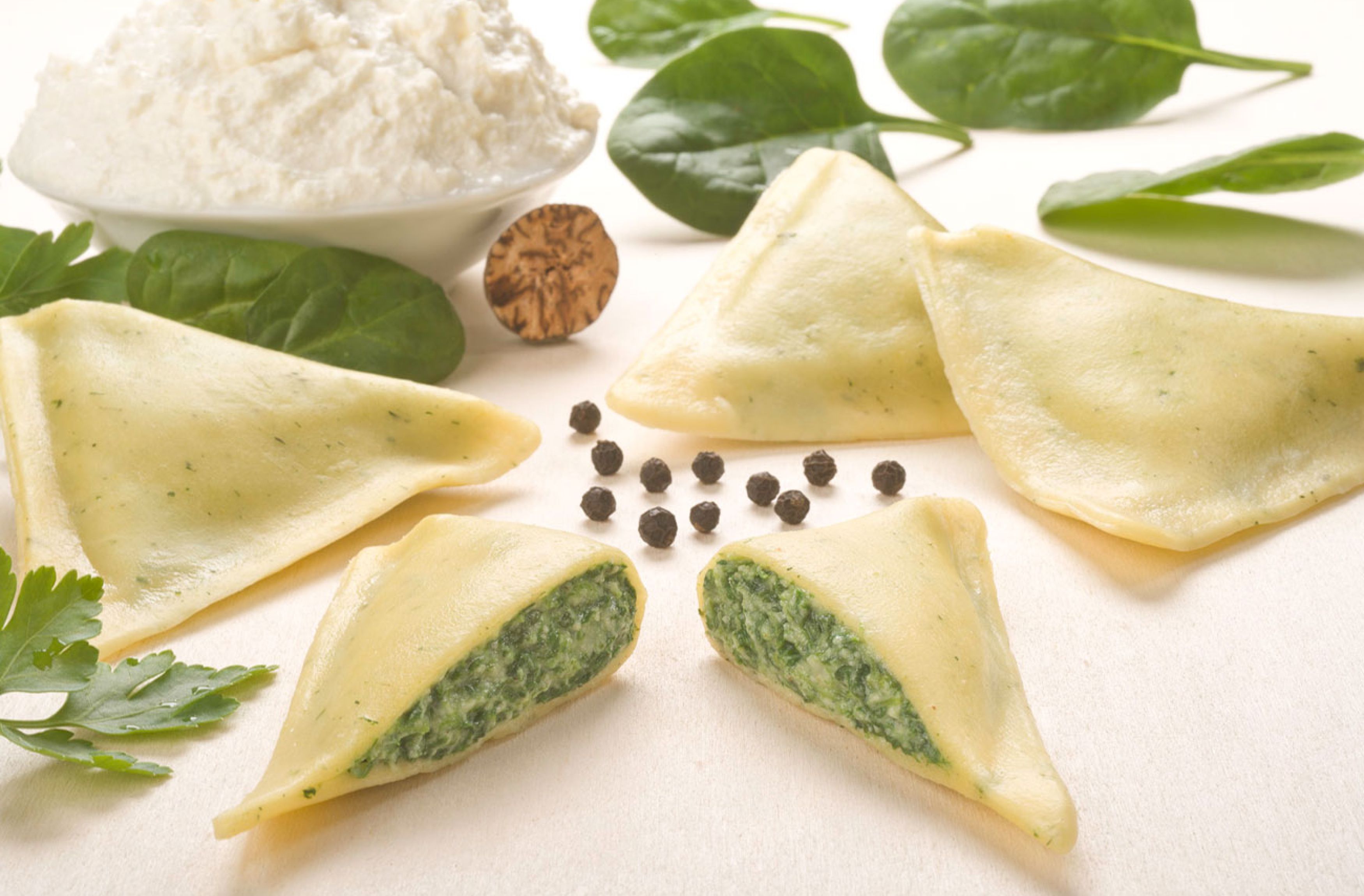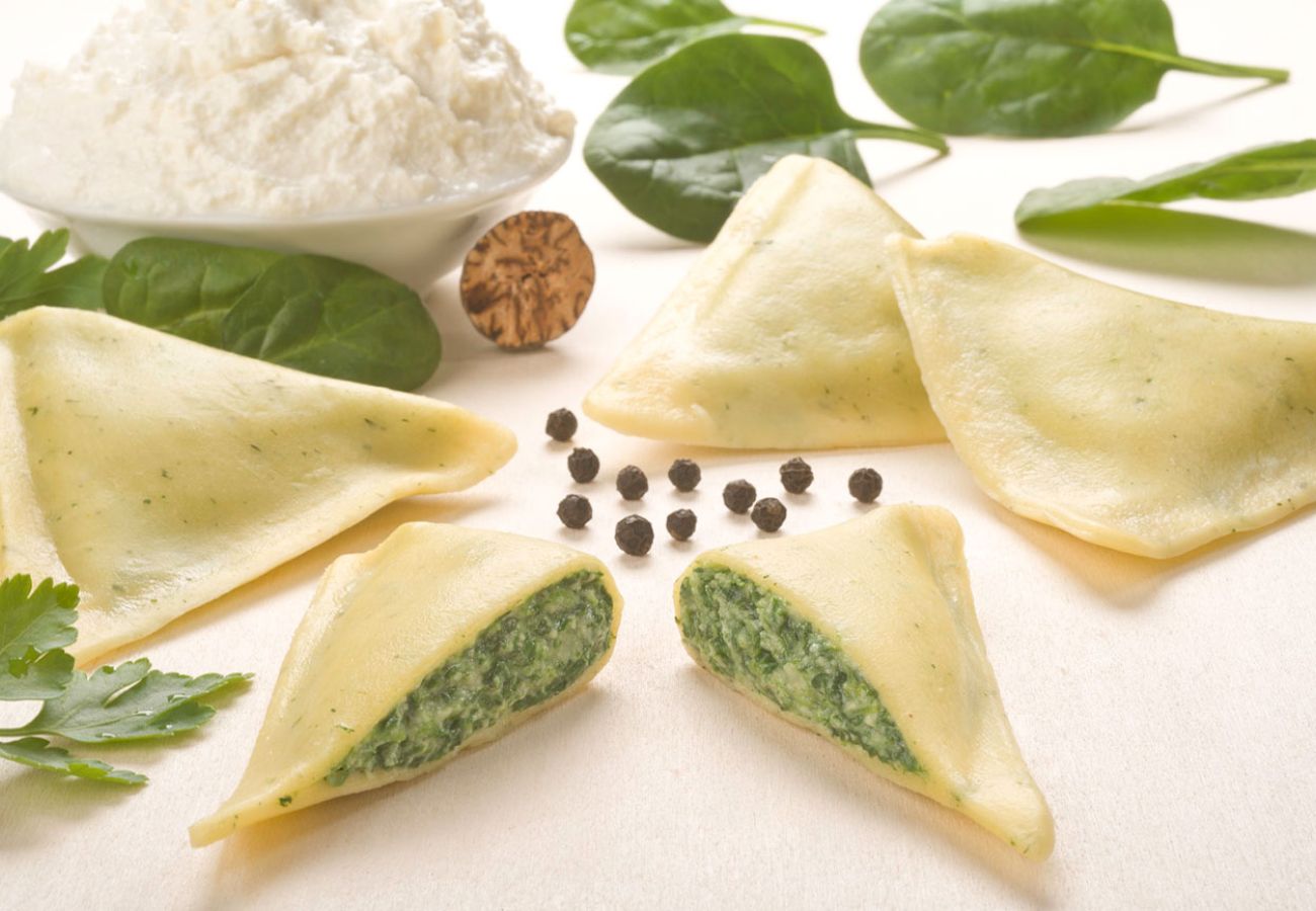 Große Teigtasche im Dreiecksformat mit feinwürzigem Büffel-Ricotta und Blattspinat
