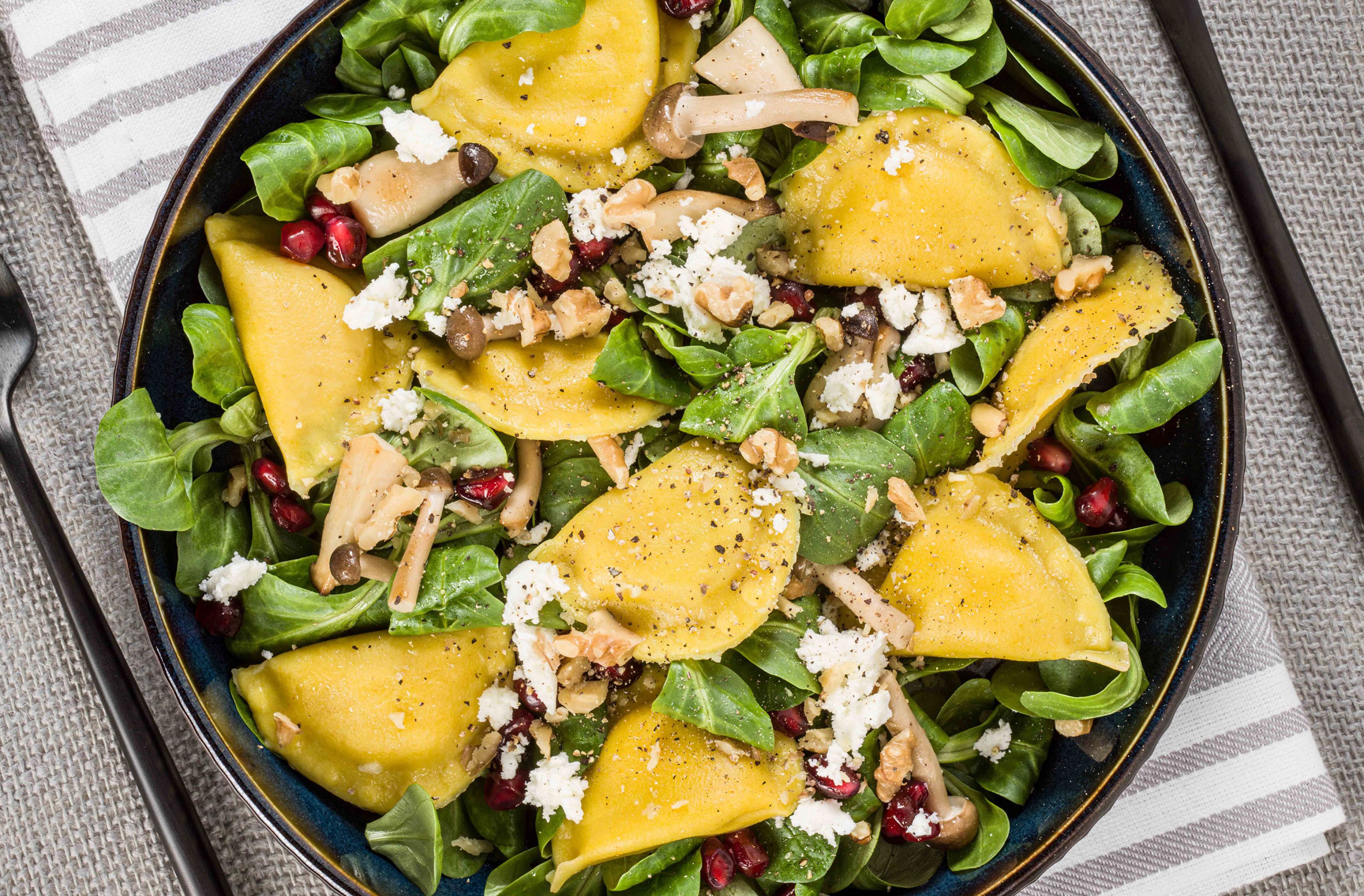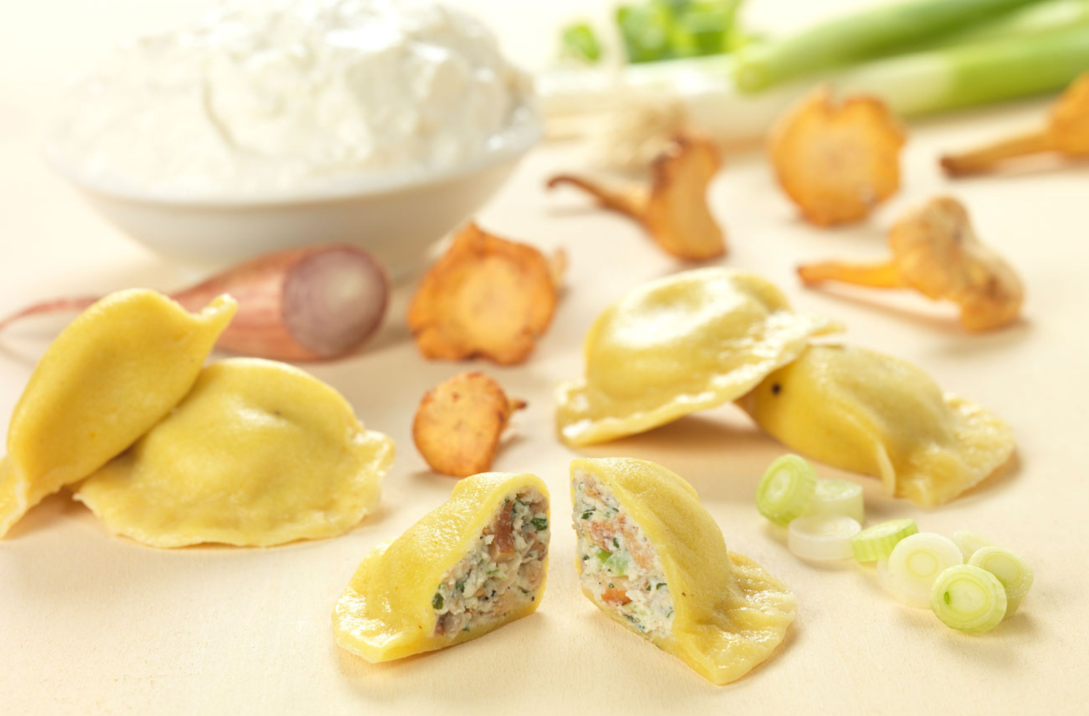 Feine Eierteigware mit einer mild-würzigen Füllung aus Pfifferlingen, Ricotta, Crème fraîche und Lauch