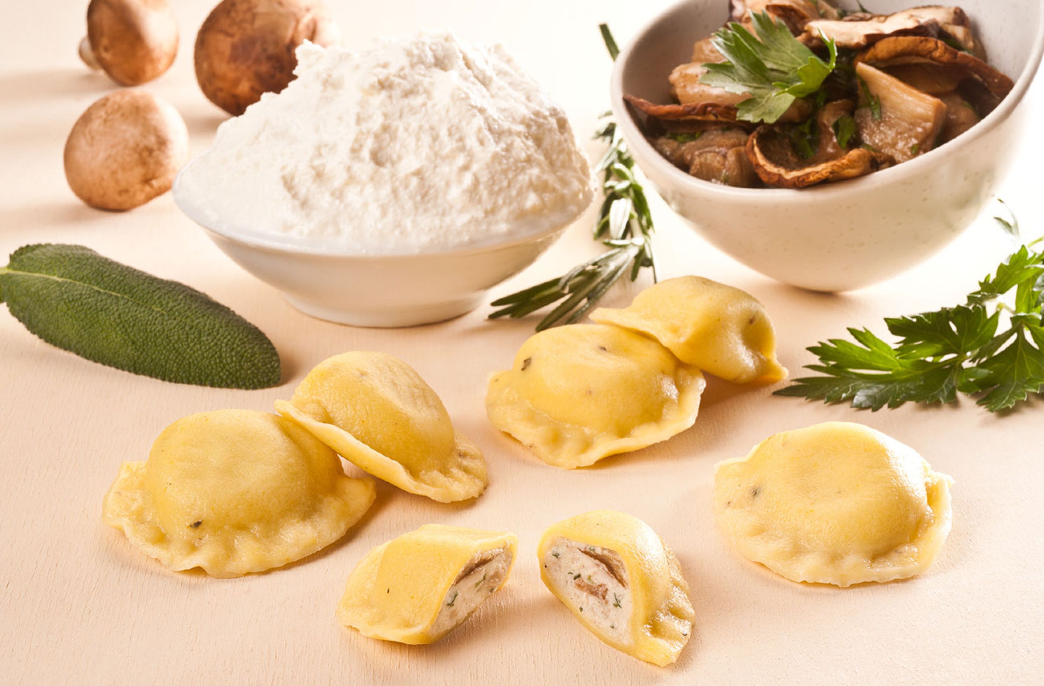 Mit einer stückig-cremigen Füllung aus Steinpilzen, Ricotta, frischen Kräutern und schwarzem Pfeffer im Teigmantel