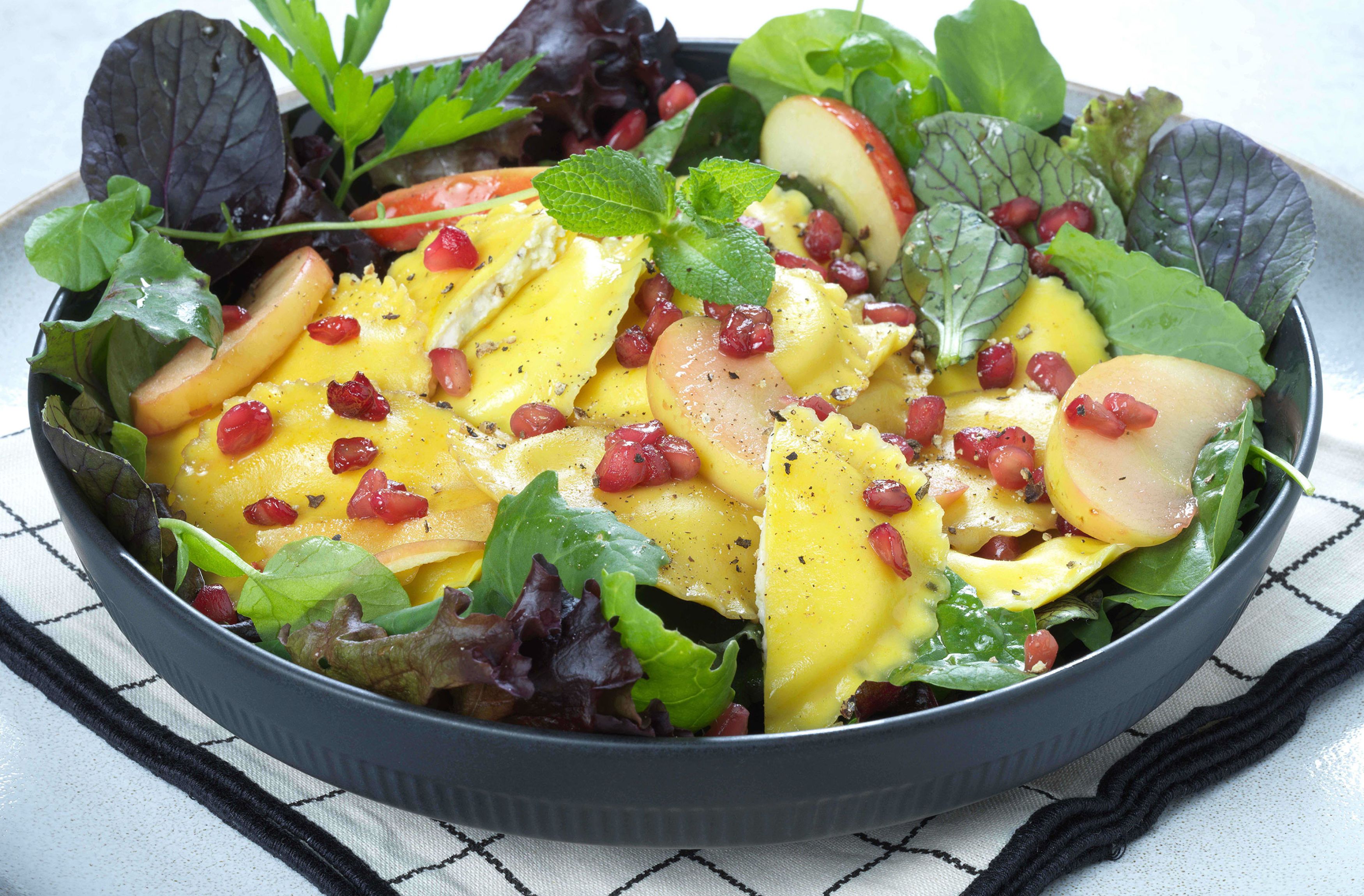 - mit bunten Blattsalaten & karamellisierten Apfelwürfeln und Granatapfelkernen