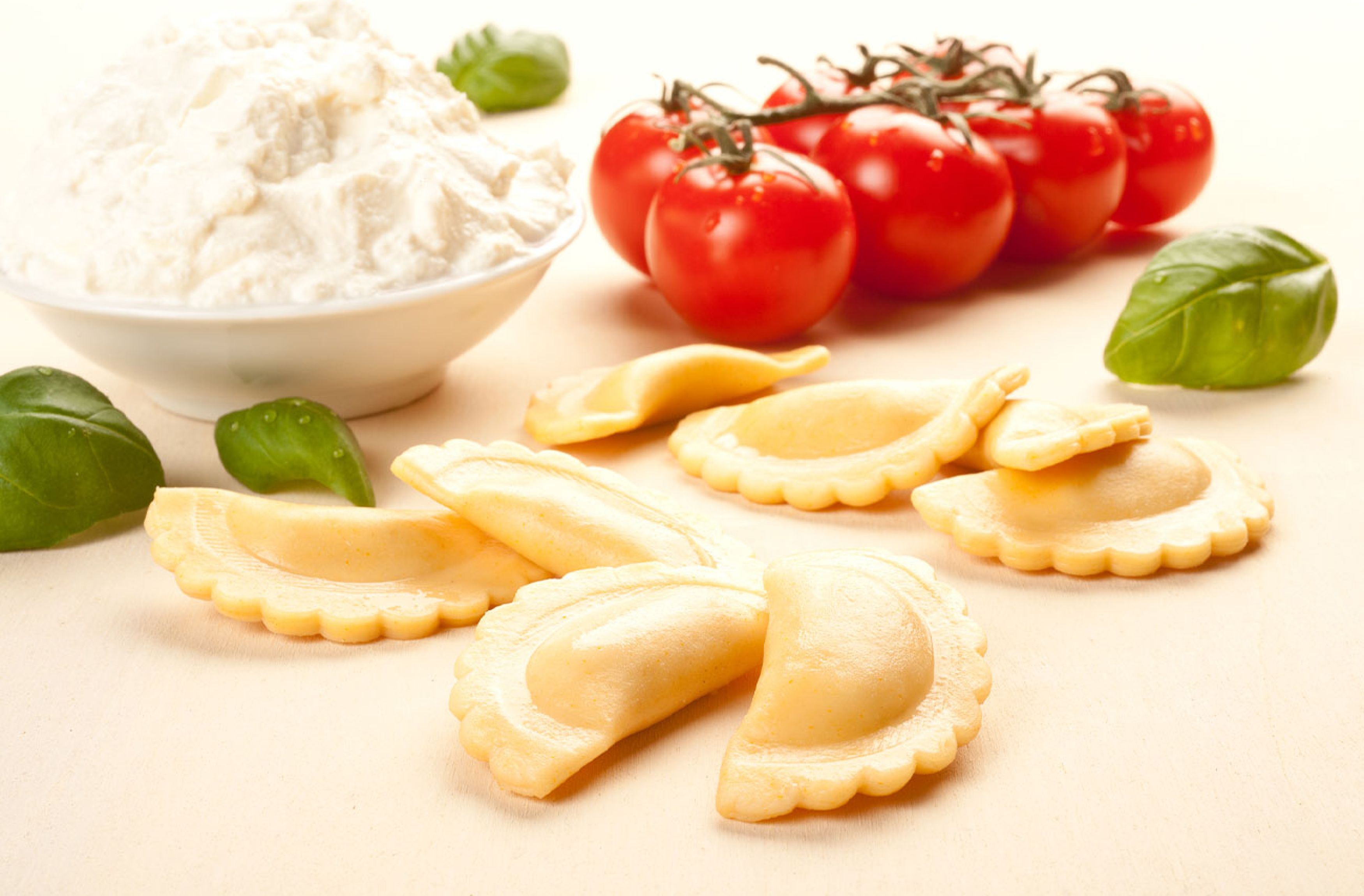 Rote Halbmondteigware mit einer feinen Tomaten- Ricotta-Basilikumfüllung