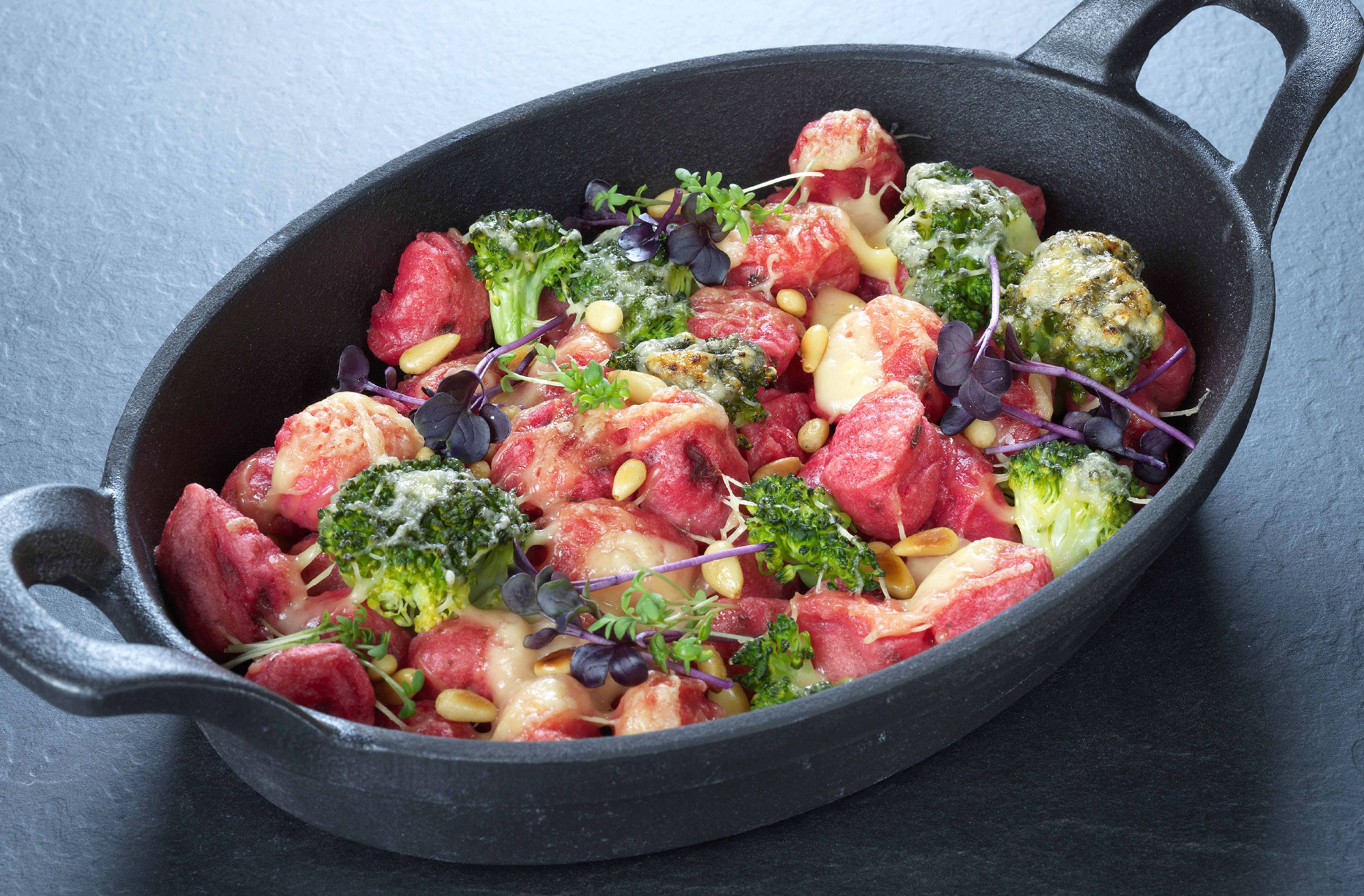 - Rote Bete Gnocchi, Ziegenkäse-Crème, Walnusscrunch