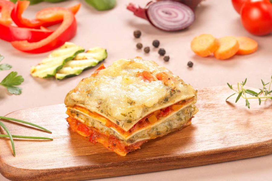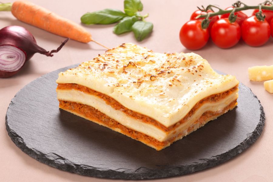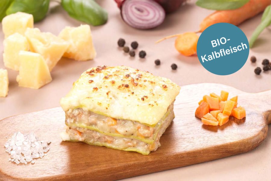 Nach Erreichen der Kerntemperatur (ca. 65-70°C) Lasagne ca. 3 Minuten ruhen lassen, dann Portionen verteilen